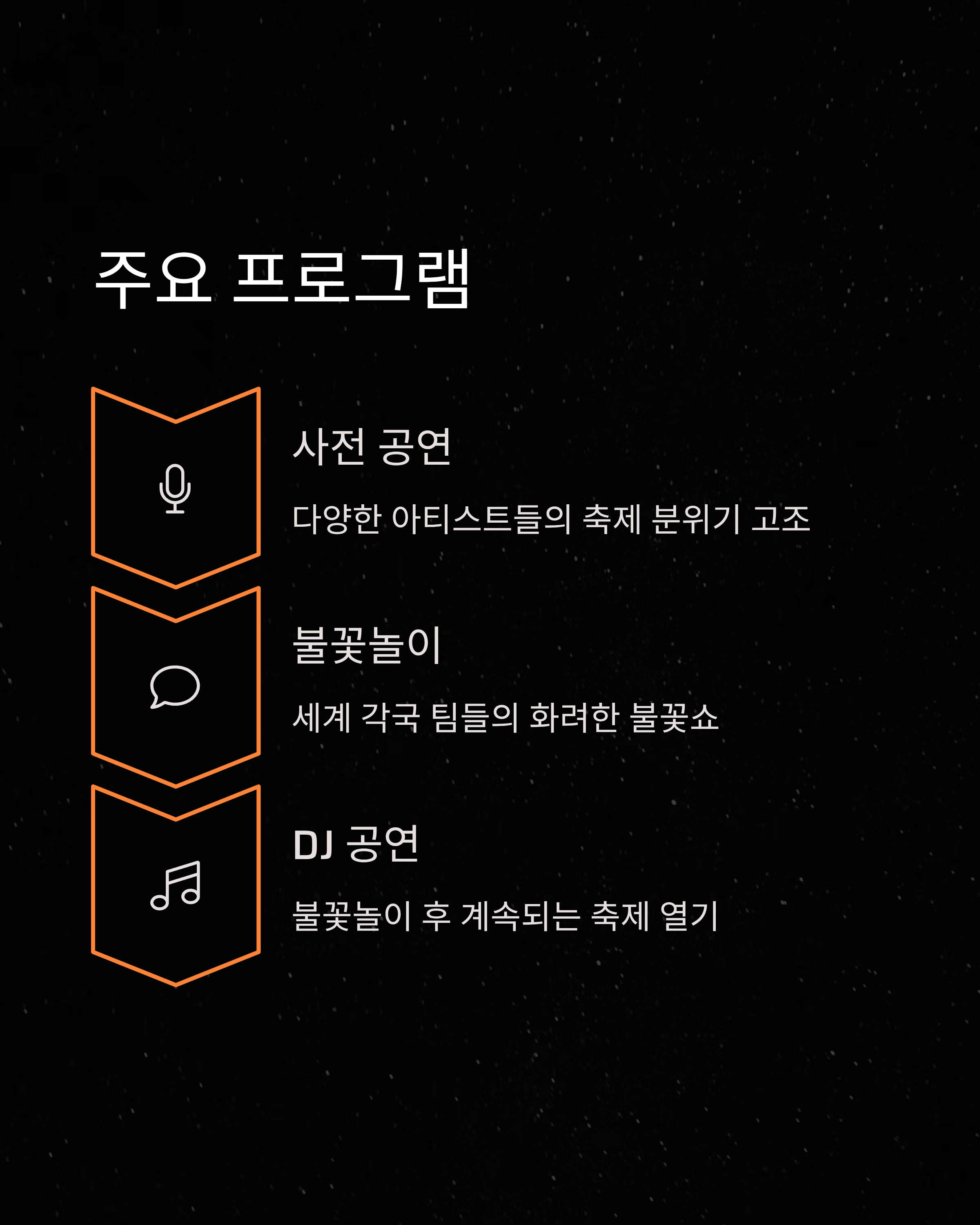 3. 애프터 DJ 공연 : 불꽃놀이가 끝난 후, DJ 공연이 이어져 축제의 열기를 계속 이어갑니다.