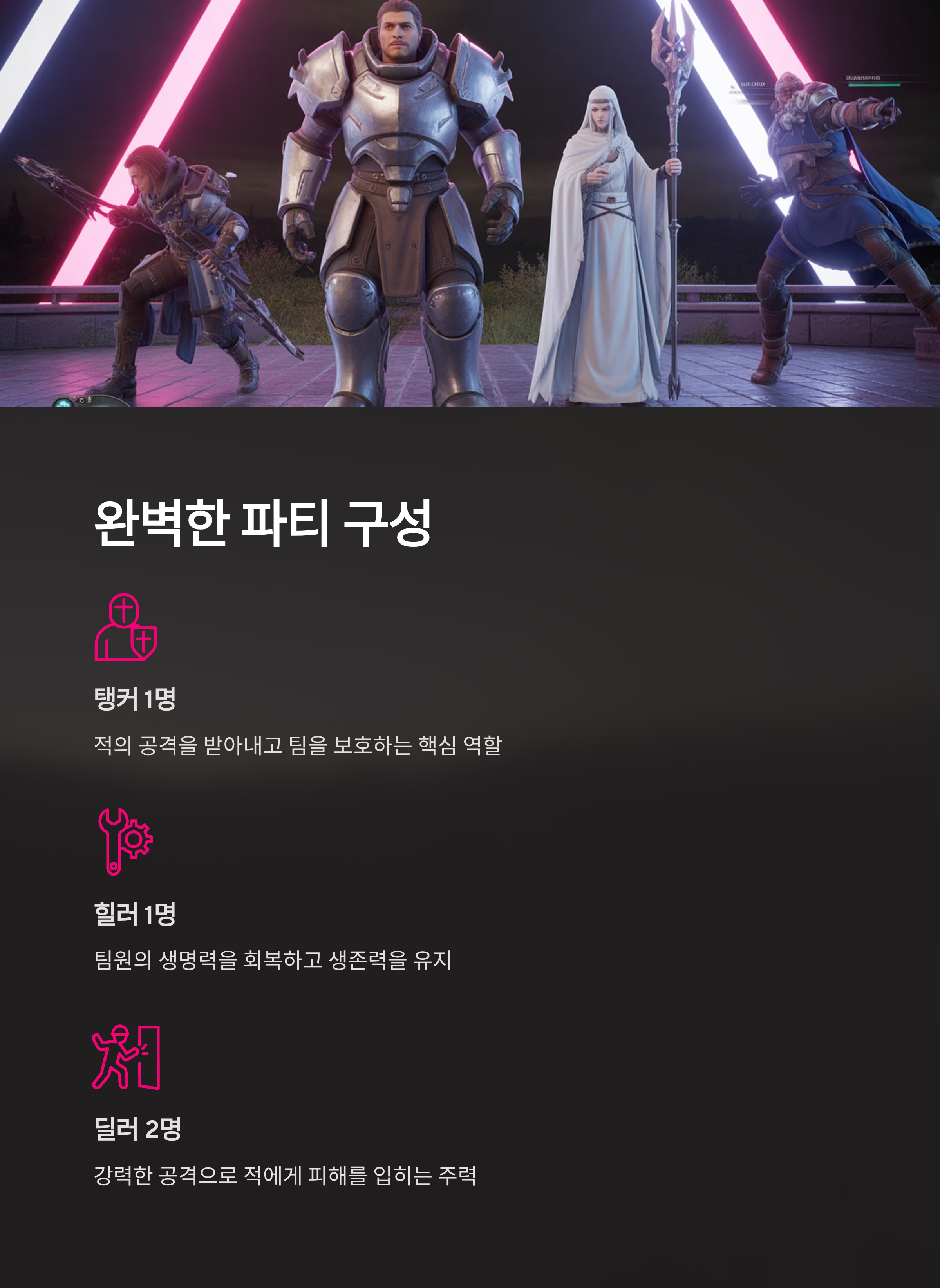 - 탱커 1명, 힐러 1명, 딜러 2명으로 시작하는 것이 안정적입니다. 필요 시 1딜러를 서포트로 바꿔 버프/디버프를 강화합니다.